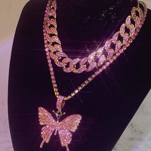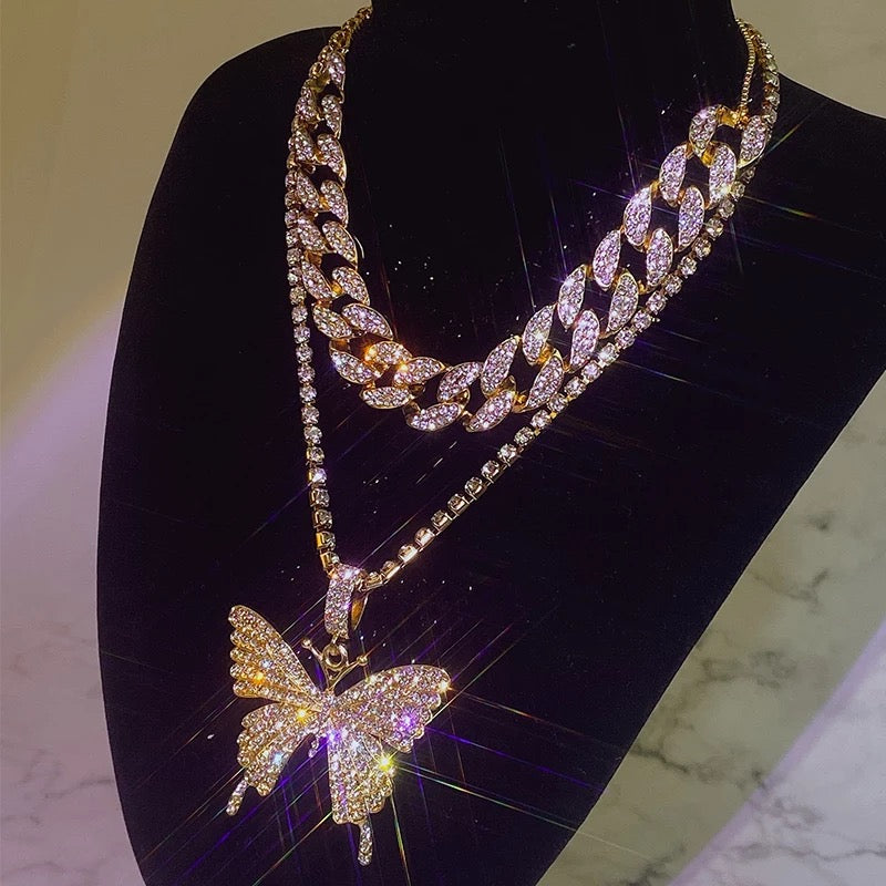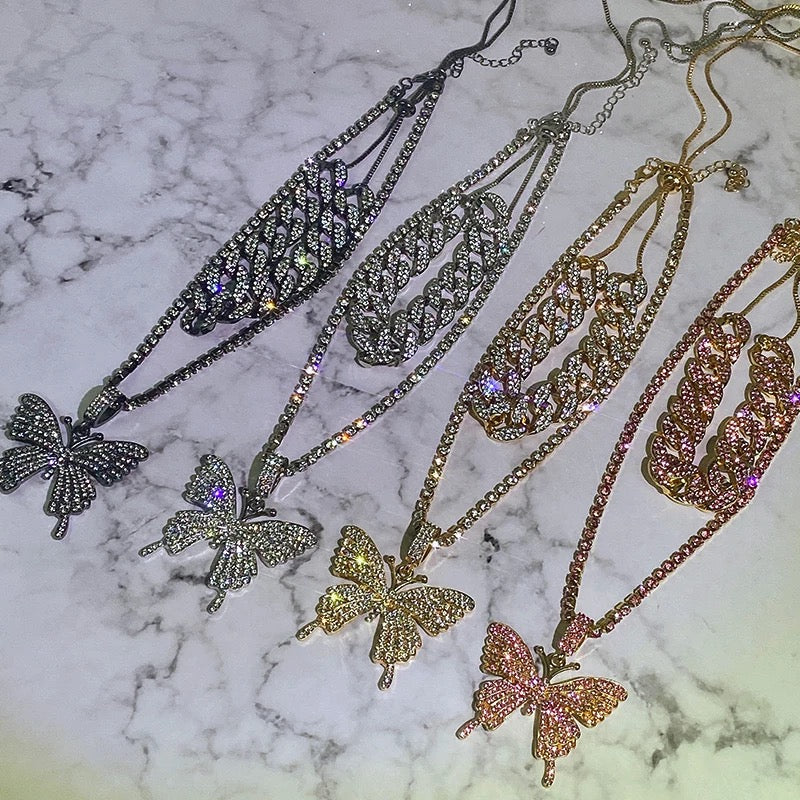Trendy 2pc fashion rhinestone jewlery set with an adjustable link chain, large butterfly pendant and cuban link choker. Very sparkley, very glamorous.