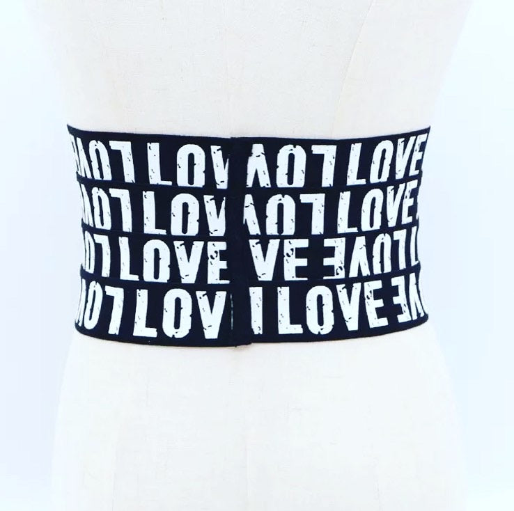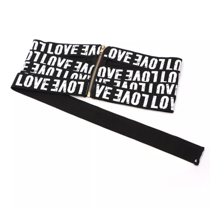 Graffiti graphic print waist clincher, 'Love' written in eraser board font.