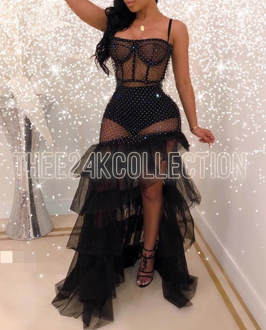 Tulle, Sheer Mesh Rhinestone Slit Party Dress comes with undergarments,Top/Bustier not included.